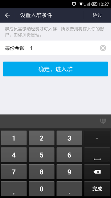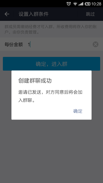 3 发起方设置入群条件,输入每份金额,点击【确定,进入群】