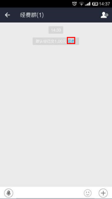 7 进入群会话页,看到系统消息默认缴的经费,点击【经费】