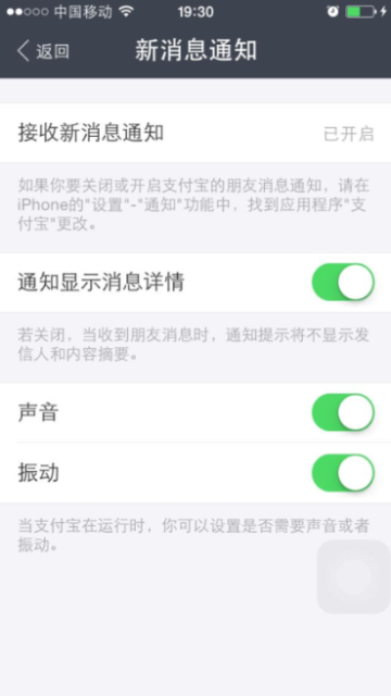 振动开关:开关开启状态,有新消息时,有振动提醒;开关关闭状态,有新消息时,无振动提醒。