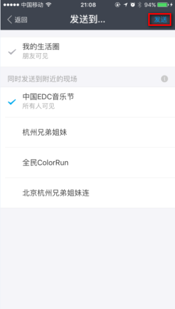 5 默认勾选“我的生活圈”且不可取消勾选,可同步勾选页面展示的的现场(发送者需要在现场区域内),点击【发送】。