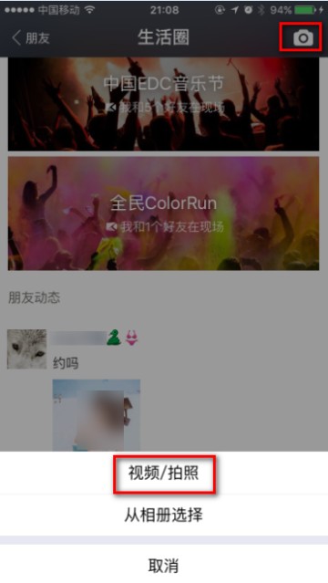 2 点击右上角图标,弹出菜单:“视频/拍照”和“从相册选择”(以“视频/拍照”为列),点击【视频/拍照】