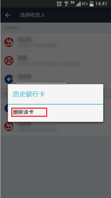 通过手机支付宝,删除转到银行卡的历史卡流程 大文 六月 5, 2016 无线支付宝 0 条评论 1951 围观 1 手机登录支付宝, 点击【转账】 2 选择【转账到银行卡】 3 点击收款人后方的图标,进入收款银行卡页面 4 展现历史收款人和本人银行卡,在历史银行卡列中选择需要删除的银行卡长按,点击【删除该卡】即可删除成功 本人银行卡含提现银行卡和绑定的储蓄卡快捷,不包括储蓄卡卡通 历史银行卡卡号展示规则:与当前支付宝账户同名的卡号做部分隐藏,反正则展示具体的卡号