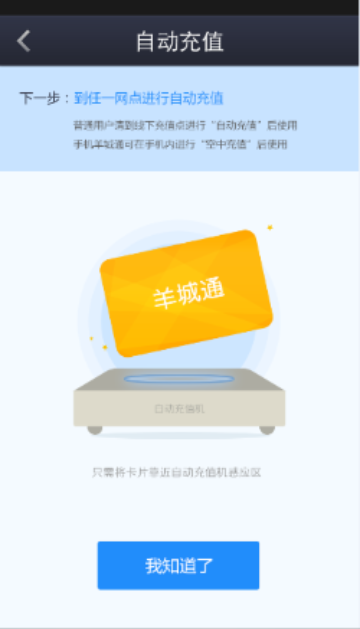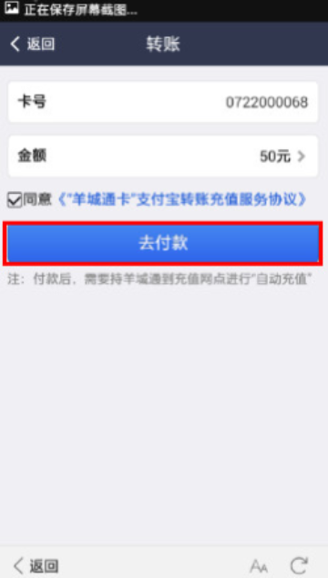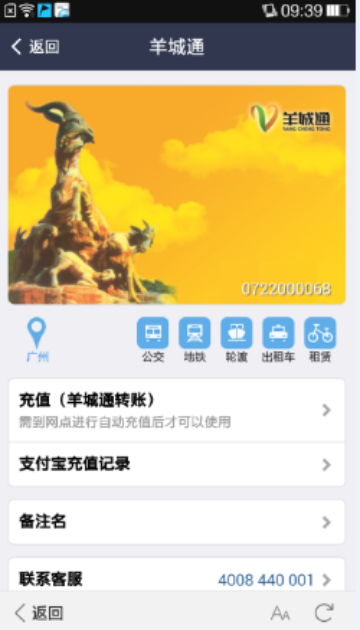 通过手机支付宝,充值羊城通流程 大文 六月 5, 2016 无线支付宝 0 条评论 1752 围观 1 在手机上登录支付宝, 点击【羊城通】 2 页面会显示添加过的可充值转账的卡,添加新卡点击右上角“+“号增加 3 输入卡号点击【确定】,即可添加成功 4 选中需充值的卡,点击【充值】; 在此页面还可查看充值记录、修改备注名、拨打客服电话等 5 确认卡号和金额,点击【去付款】 6 付款成功后,页面会有到网点进行自动充值的提示