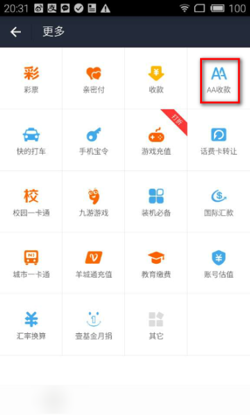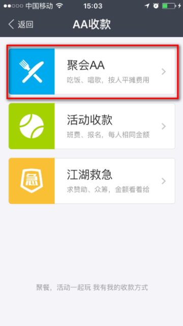 2 进入后有聚会AA、活动收款、江湖救急(以 聚会AA为例),选择【聚会AA】