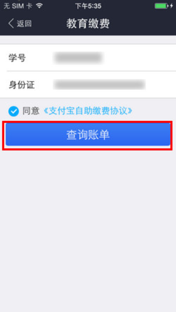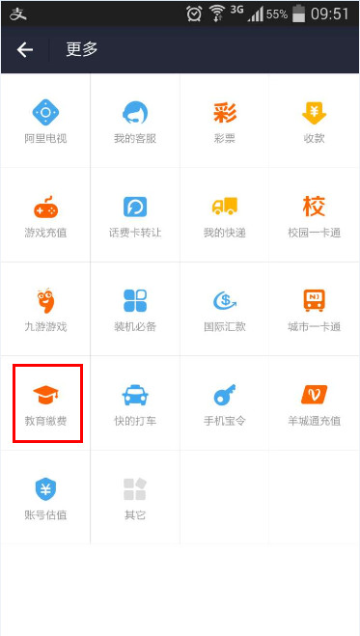 通过手机支付宝,操作教育缴费流程 大文 六月 5, 2016 无线支付宝 0 条评论 1387 围观 1 手机登录支付宝, 点击【教育缴费】 2 选择对应的省份和学校,点击【下一步】 3 输入学号和身份证, 点击【查询账单】 4 选中要支付的费用项 5 点击【去付款】 6 输入支付密码,点击【付款】 7 缴费成功
