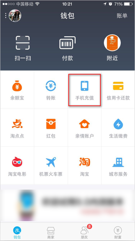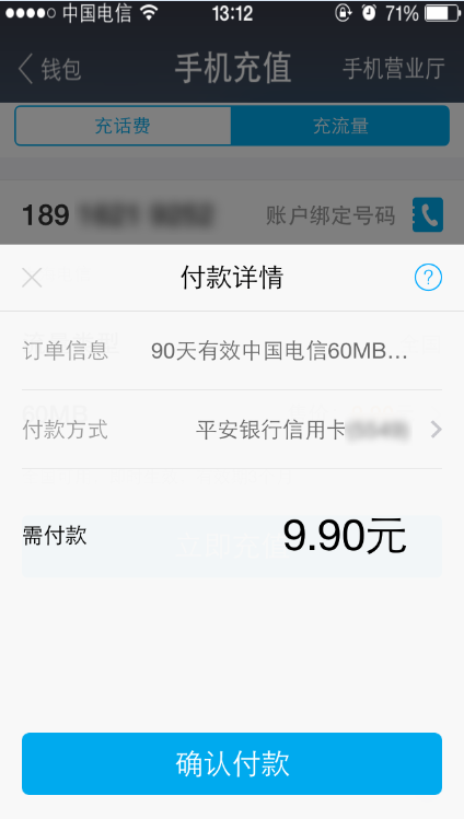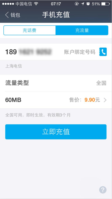 手机流量充值操作流程(9.0) 大文 六月 5, 2016 无线支付宝 0 条评论 4569 围观 1、在手机上登录支付宝,点击【手机充值】 2、选择【充流量】,输入手机号码,选择流量类型和套餐,点击【立即充值】 3、点击【确认付款】 4、付款成功之后,返回充值结果