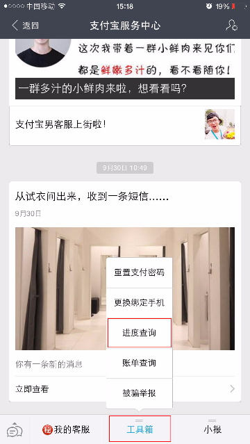 通过支付宝服务中心,查询业务进度 大文 六月 5, 2016 无线支付宝 0 条评论 2134 围观 1 手机登录支付宝, 点击【朋友】—【服务窗】或首页【服务窗】 2 选择【支付宝服务中心】 3 点击【工具箱】—【进度查询】 4 进入进度中心,点击需要查看的选项,即可看到进度