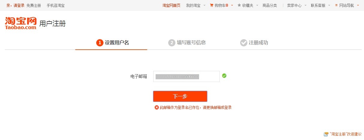 注册时,提示“此邮箱作为登录名已存在,请更换邮箱或登录”怎么办? 大文 六月 6, 2016 账号与安全 0 条评论 7662 围观 亲,这是因为此邮箱已经注册过其他淘宝账号账户,您可以换个其他邮箱注册哦~ 若邮箱长期以来一直是您在使用,有可能您已经注册过淘宝账户,您可以直接使用该邮箱作为账户名找回密码后使用就可以啦~