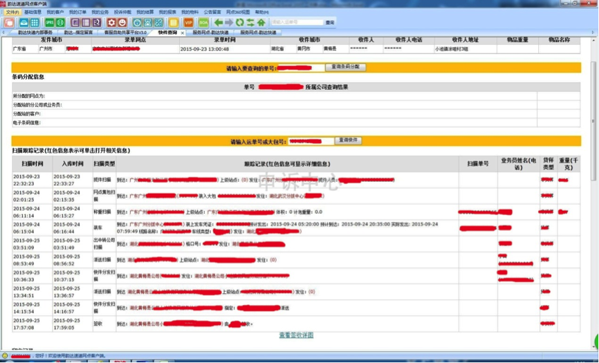 • 非快递公司官网查询流转信息,而是快递公司内部系统跟踪信息截图(需要联系快递公司获取)
