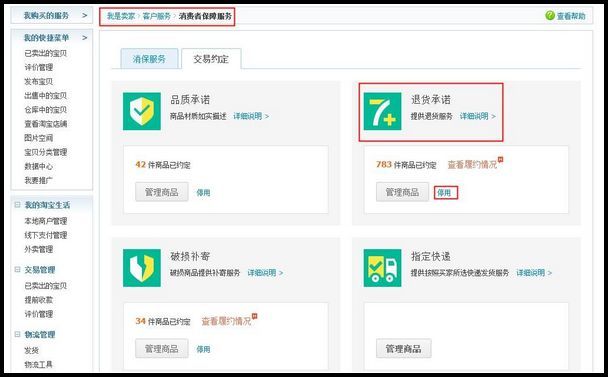 如何退出退货承诺服务 大文 六月 7, 2016 交易管理 0 条评论 1667 围观 亲爱的会员, (1)整个交易约定服务停用: 卖家可进入卖家中心“消费者保障”中“交易约定”选定“退货承诺”,操作“停用”。 (2)单个商品停用交易约定服务: 卖家可进入卖家中心“消费者保障”中“交易约定”,在商品管理界面,选中要停用的商品后再选择“未约定”即可进行单个商品的停用。