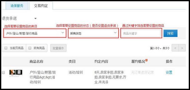 “退货承诺”是交易约定服务中的一种类型,指卖家承诺店铺内商品支持购买后退货的服务。卖家可针对不同商品设置不同的服务条件,如可设置店铺某一类商品的服务条件为:买家在卖家承诺时间内拆封亦可退货,退货邮费由买家自理。