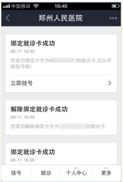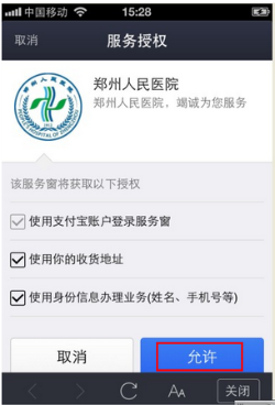通过支付宝钱包,郑州人民医院公众服务绑卡流程 大文 六月 7, 2016 无线支付宝 0 条评论 1886 围观 1 手机登录支付宝, 在【服务窗】中添加【郑州人民医院】服务号,点击【授权】 2 选择对应的就诊卡,点击【确认绑定】