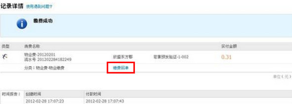 怎么查看自己的缴费记录? 大文 六月 7, 2016 应用中心 0 条评论 1191 围观 1 登录支付宝账户(www.alipay.com), 点击生活服务下的【水电煤】, 点击【缴费记录】 2 选择【缴费时间】,查询缴费记录,点击【详情】 3 显示物业缴费账单的详细信息,点击【缴费回单】 4 显示详细账单信息