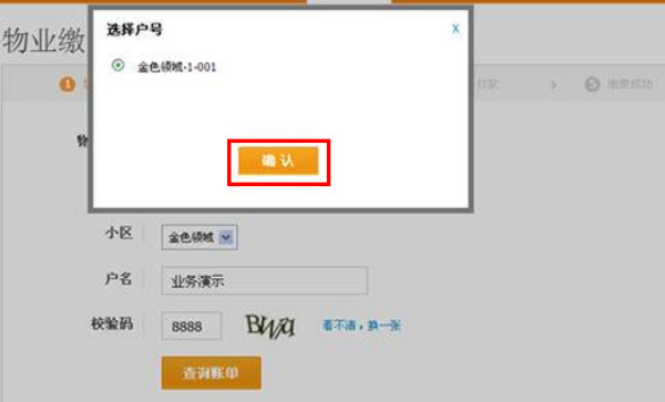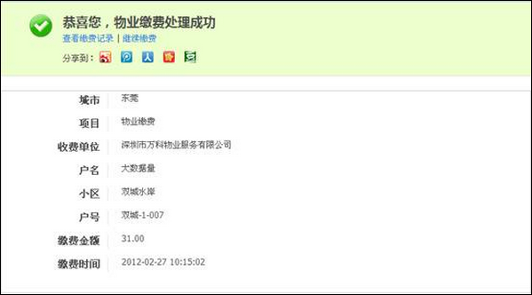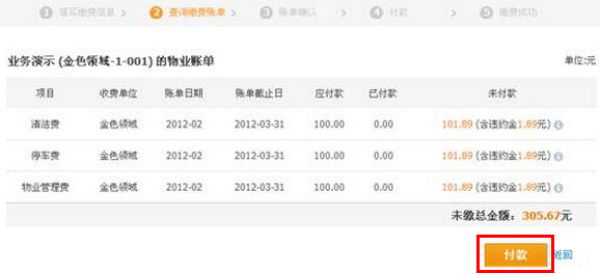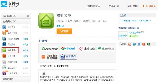 物业缴费的操作流程 大文 六月 7, 2016 应用中心 0 条评论 2093 围观 电脑上点此进入物业缴费 1 登录支付宝账户(www.alipay.com), 点击生活服务下的【水电煤】 2 进入应用中心页面,选择【物业费】,点击【立即缴费】 3 选择“物业公司”,“城市”,“小区”,填写户名,点击【查询账单】 4 页面会显示对应的户号,选择【户号】,点击【确认】 5 页面会显示到详细账单,点击【付款】 6 核对账单,点击【确认支付】 7 选择付款方式后付款 8 提示缴费成功。同时可以分享到微博等社区