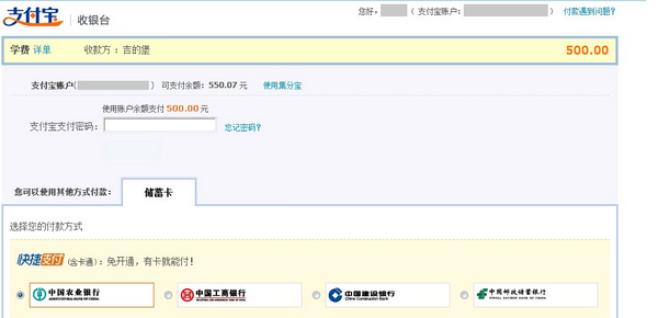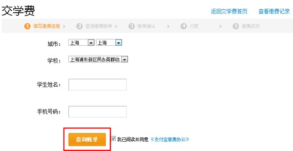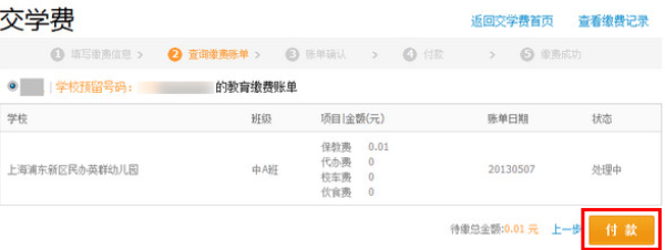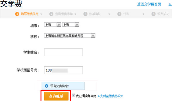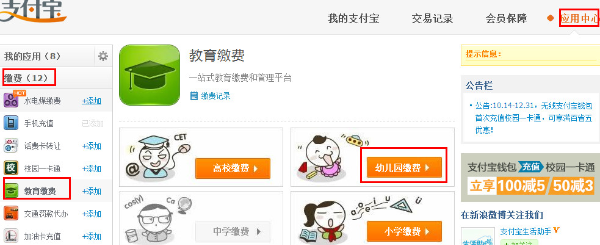 幼儿园缴费操作流程 大文 六月 8, 2016 应用中心 0 条评论 2763 围观 1 登录支付宝账户(www.alipay.com), 点击【应用中心】—【教育缴费】, 选择【幼儿园缴费】 2 填写学生姓名和手机号码任意一项即可, 点击【查询账单】 3 如果有对应账单信息,会显示该账单,可点击【付款】 4 点击【确认支付】到收银台付款 5 选择支付方式进行付款即可 6 温馨提示:点击【查询账单】后,如果查询不到账单信息,则会显示没有欠费信息