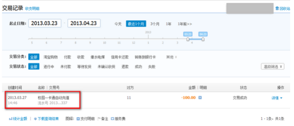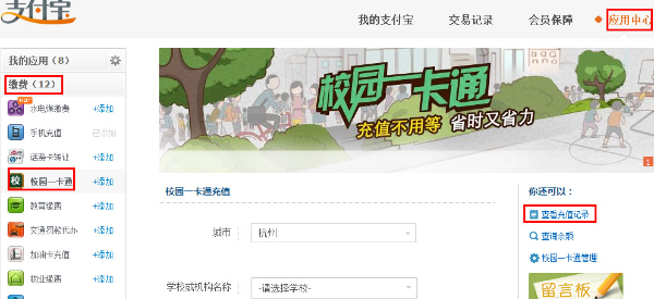 如何查看校园一卡通交易记录? 大文 六月 8, 2016 应用中心 0 条评论 5237 围观 1 登录支付宝账户(www.alipay.com), 点击【应用中心】—【校园一卡通】—【查看充值记录】 2 交易记录显示