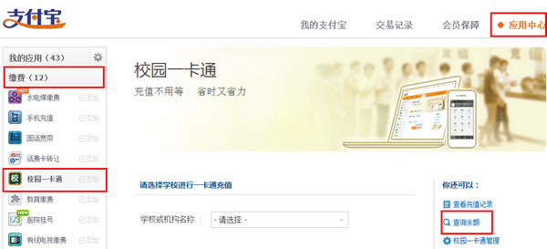 如何查看校园一卡通余额? 大文 六月 8, 2016 应用中心 0 条评论 4098 围观 1 登录支付宝账户(www.alipay.com), 点击【应用中心】—【 校园一卡通】—【余额查询】 2 选择学校,输入卡号,点击【查询】即可
