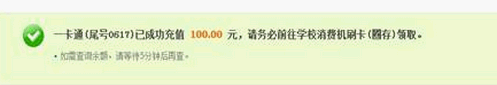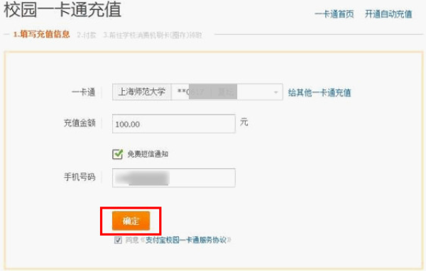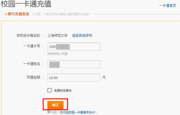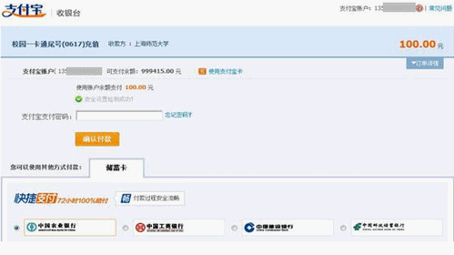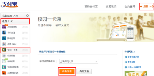 校园一卡通自助充值流程 大文 六月 8, 2016 应用中心 0 条评论 1691 围观 1 登录支付宝账户(www.alipay.com), 【应用中心】—【 校园一卡通】,点击【自助充值】 2 如果该账号曾有过充值记录,直接输入充值金额,点击【确定】 3 如果是首次充值,需要输入卡号、姓名和金额,点击【确定】 4 进入收银台付款页面选择支付方式支付 5 付款成功