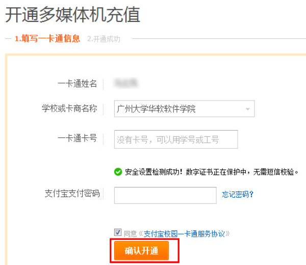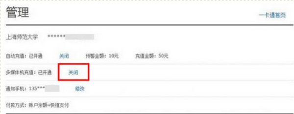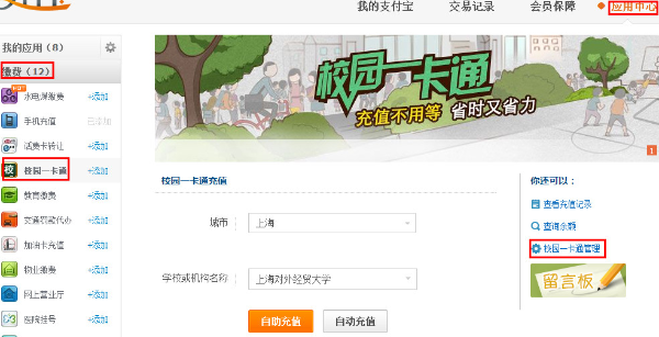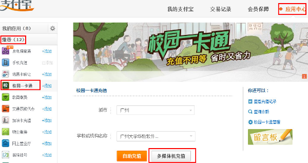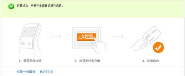 如何开通校园一卡通多媒体机充值功能 大文 六月 8, 2016 应用中心 0 条评论 1817 围观 1 登录支付宝账户(www.alipay.com), 点击【应用中心】—【 校园一卡通】,选择相应的学校点击【多媒体机充值】 2 开通多媒体机充值功能,输入一卡通卡号及支付密码,点击【确认开通】 3 开通成功 4 若需关闭多媒体充值功能,点击【校园一卡通管理】 5 点击【关闭】 6 点击【确定】