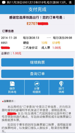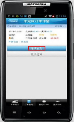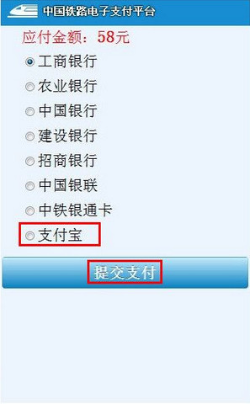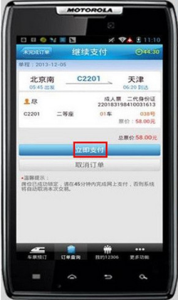 如何在12306客户端上,通过支付宝购买火车票 大文 六月 8, 2016 应用中心 0 条评论 1446 围观 1 登录铁路的手机客户端上选票 2点击【提交订单】确认票务订单 3 点击【进入未完成订单】 4选中【继续支付】 5 继续点击【立即支付】 6选中【支付宝】付款,然后点击【提交支付】 7 输入支付密码,点击【付款】 8付款成功,点击【返回】 9 页面跳回铁路手机客户端页面,显示订单信息。