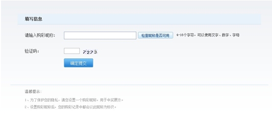5、首次在500彩票网购买彩票的用户会跳出填写昵称(如果已经有过购买记录,这一步跳过,直接跳到第6步,跳转到支付宝收银台);