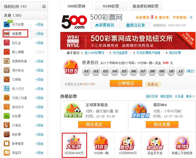 1、登录支付宝网站,点击【应用中心】——【买彩票】——【500彩票网】,选择彩种;