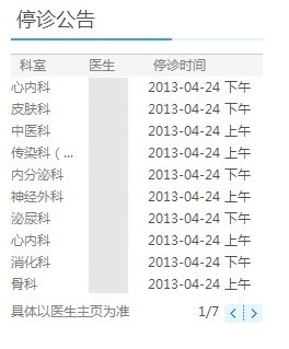 您可以在各医院主页右侧查看该医院最近一周的停诊信息