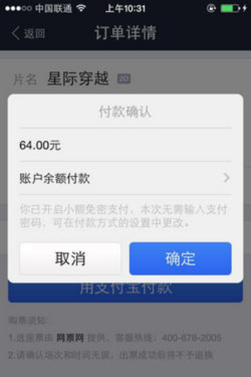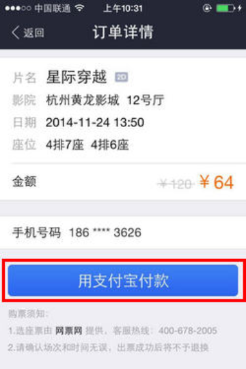6 确认订单信息(包含认电影名称、影院、日期、座位和金额),确认手机号码,点击【用支付宝付款】