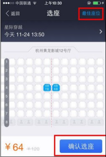 5 选择座位,可以使用【最佳座位】选座(【最佳座位】是系统推荐座位),选座完成后,点击【确认选座】