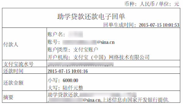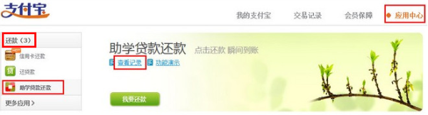 如何查询助学贷款还款记录 大文 六月 9, 2016 业务发展 0 条评论 1635 围观 1 登录支付宝账户(www.alipay.com), 通过应用中心主动还款:点击【应用中心】—【助学贷款还款】—【查看记录】 2 点击详情中的【电子回单】 3 输入申请人姓名、身份证号码及支付密码,点击【确认申请】 4 点击【下载电子版】 5 查看回单