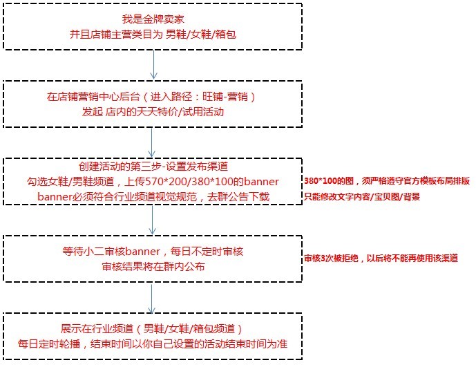 店铺营销中心联合女鞋/男鞋/箱包频道首次向卖家的单店活动开放频道的banner资源,只要本店有正在进行中的特价/试用活动,该活动就有机会在女鞋/男鞋频道进行展示,点击后跳转到单个活动详情页。