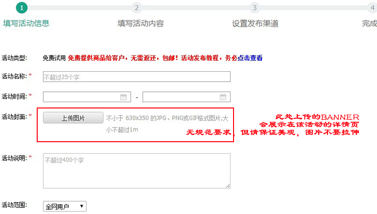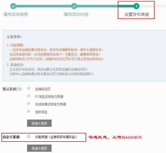 【第3步】在设置发布渠道中,勾选自定义渠道-女鞋/男鞋频道,上传符合视觉规范的活动封面banner