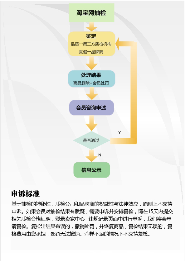 1、 品质控制专注于策略研究和商品抽检,在分析各个行业的发展趋势和品质问题的前提下,结合目前淘宝线上类目的需求,提出可行解决途径和具体措施,现从商品抽 检着手,针对在售商品进行抽检,并委托第三方权威机构进行鉴定,依据鉴定结果做出相应处理。淘宝网在各环节制定了严格的执行流程:商品抽检→第三方鉴定→ 商品处理→信息披露。
