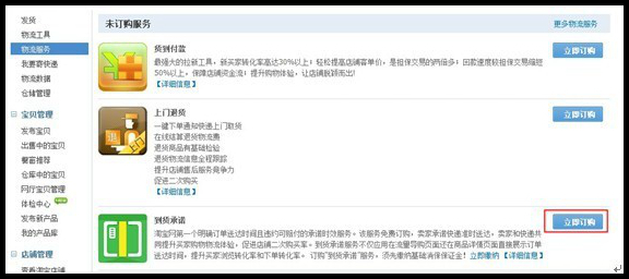 1.2.1 符合条件的卖家可进入“卖家中心”-“物流服务”页面,选择“到货承诺”服务,点击“立即订购”按钮,如下图: