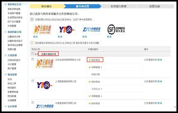 卖家可批量开启提供到货承诺的快递公司,也可针对单个快递公司启用。但到货承诺的订单在实际发货时需联系有能力提供次日送达的快递发货哦(可选择到货承诺服务配置的快递公司中的任何一家发货,包含自己联系物流和在线下单发货)!