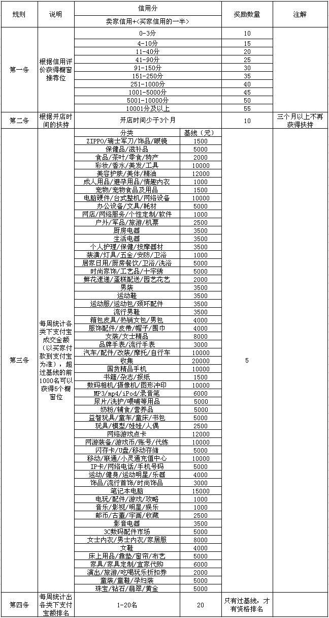 3.3 第三、四条的计算方法是:周五系统运行程序,统计一周(周五早上零点到下周四晚上23:59:59)的支付宝成交情况,橱窗推荐位的有效期从周六凌晨0点到第二周的周五晚上23点59分为止;