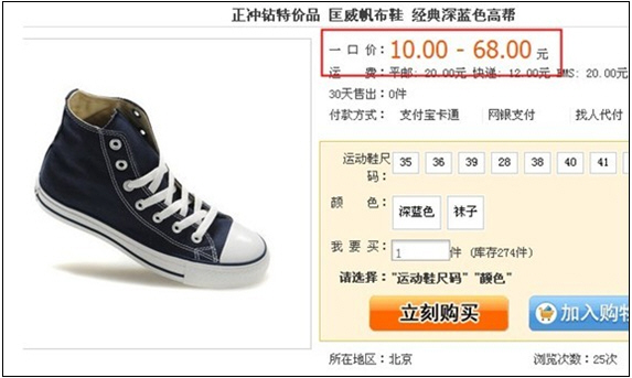4、标题、图片与属性不符 案例1:标题和图片都是匡威鞋,属性里面有袜子,利用价格区间拉低价格,以吸引流量。