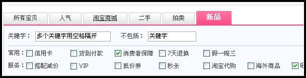 (1)“搜索结果页面”和“类目宝贝列表页面”中,有新品选项,对某个类目某个关键词下的新品进行聚合展现。