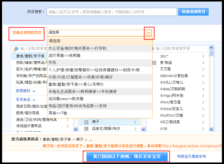 您也可以从一级类目开始,往下选择类目。有一些比较容易混淆或者选择错误的类目下,有该类目的一些注释和发布的建议和提醒,请注意。例: