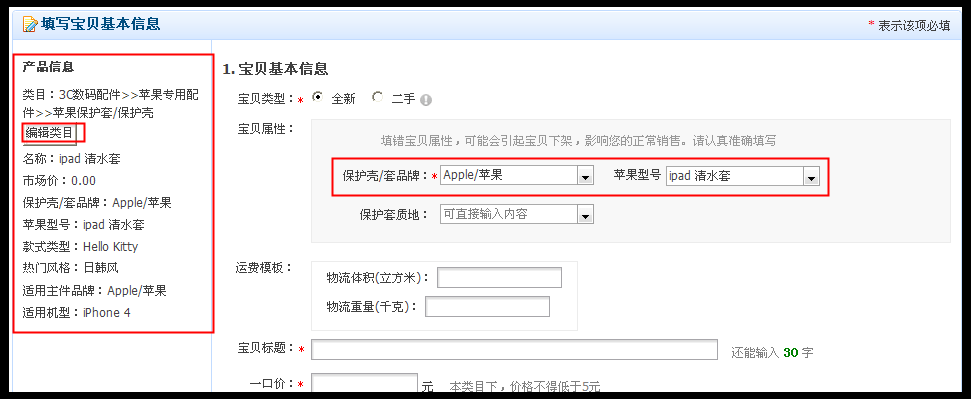 一般的商品,淘宝都有分出贴切的类目或者属性,所以您可简洁的以输入商品名称,系统会自动帮您寻找与此相同的类目或属性。例:搜索商品的品牌”苹果”,就会出现对应的类目属性,选择并确认提交。