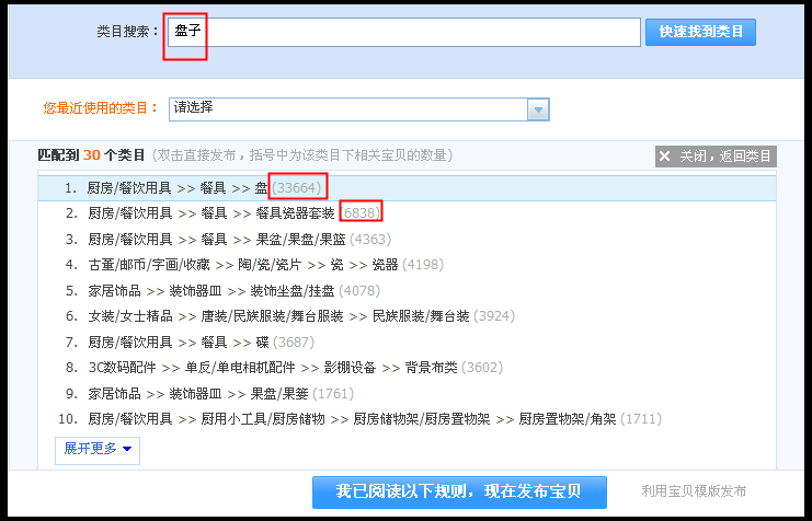 如果您所输入的关键字,没有名称与此完全匹配的类目和属性,那么系统会根据在线商品的标题中的关键字,展示出商品数量最多的前10个类目,并在每个类目后显示对应的商品数量。例: