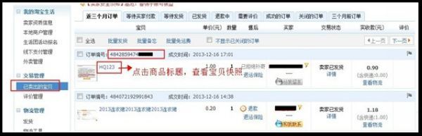 第一步:点击卖家中心-已卖出的宝贝(http://trade.taobao.com/trade/itemlist/list_sold_items.htm),通过该商品的订单,点击商品标题查看宝贝快照,如图: