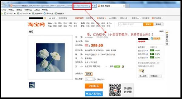 方法一. 直接打开商品的详情页面,看到浏览器地址栏中的宝贝链接,链接中等于号后面的数字就是宝贝ID,如图: