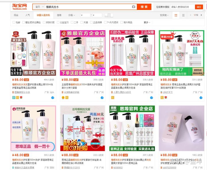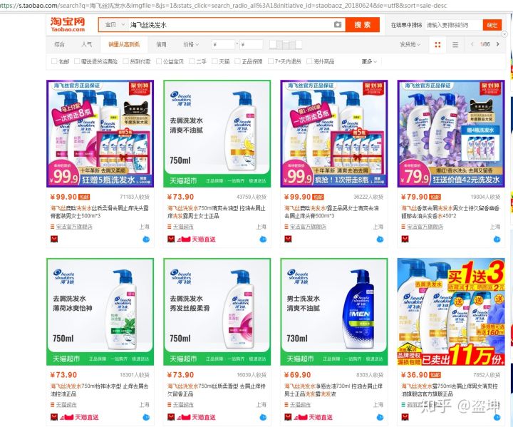 请注意看,当你在淘宝输入”海飞丝洗发水“的时候,按销量排名,销量最高的是7万多人收货,前八名全是猫店,而前八名全部月销过万。你有什么信心能竞争过他们?