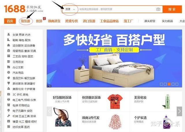 3.选择淘货源(以前叫做一件代发),或者直接搜索自己想要代发的宝贝(图中箭头所指的方向)。