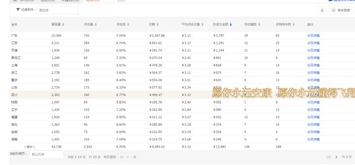 收藏购物车率高,点击转化率高,首先要做到关键词精准和人群精准,其次要做到地域精准,我们要曝光给一些地域,转化率高的地域,不能把曝光浪费在没转化或者转化很弱的地域。我们在报表,直通车报表里选择我们推广的计划,找到地域列表,看数据成交额,购物车,收藏这些数据。