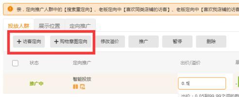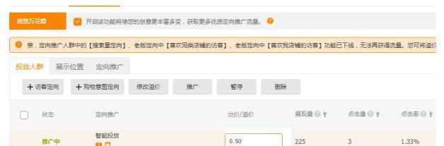 前期我们开定向先给智能投放出一个价格,给5毛左右就可以,位置展示里面手淘首页猜你喜欢我们先来溢价50%左右,不要太高也不要太低。