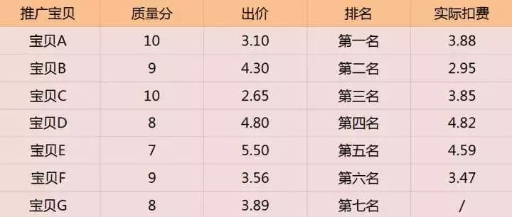 1. 宝贝A质量分为10分,并且为了获得最多的流量,所以敢出价,但即使是10分,实际扣费还是比出价高;2. 宝贝B虽然质量分不是最高的,但是,实际扣费却是最少的,因为宝贝B巧妙地卡在了C宝贝的前面;3. 宝贝C的质量分虽然是10分,但实际扣费比出价高出不少,宝贝C出价低,本意是想少花点钱,但倒霉就倒霉在它排在了宝贝D的前面;4. 宝贝D质量得分低,出价高也最多能排到第四名,实际扣费跟出价差不多,不算太冤;5. 宝贝E质量分最低,想要冲到前面只能出价最高,但实际扣费竟然比出价低;6. 宝贝F质量分还算可以,但不太敢出价,实际扣费也没少多少。