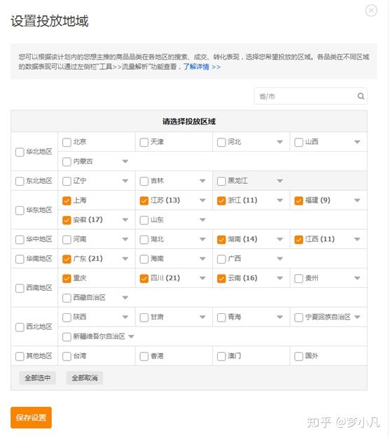如果我们现在卖的是夏装商品,你比如说服饰,水果等,我们可以根据人群地域需求比较的多地区进行投放,这些部分地区我们可以进行选择性投放,这样获取到的人群点击和转化也是会更精准的。设置好之后我们点击保存设置即可。这些设置好之后是不是就已经结束了,其实重要的还是刚刚开始。