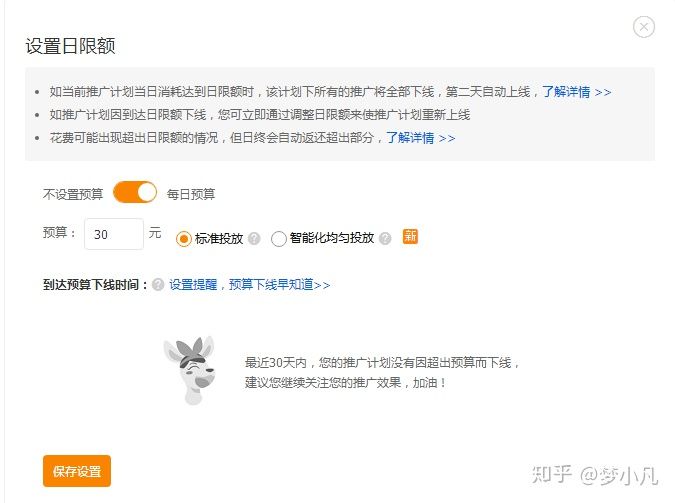 我们店开通每日预算,每日投放时间是根据自己的能力需求投放日限额,最低日限额是30元,我们选择标准投放就是可以了,设置好后点击保存设置即可。